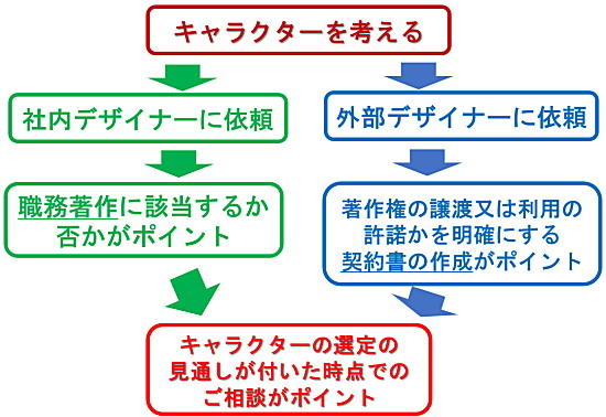 このような場合に対応するために、事前に社内デザイナーなどが作成したキャラクターのデザインについて、社内でどのように取り扱うべきかの仕組みを構築しておかれることをお勧め致します。
